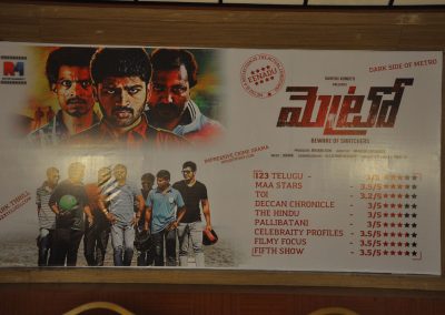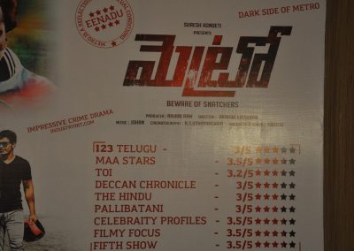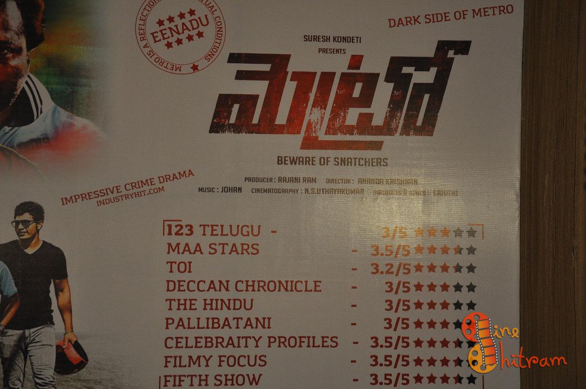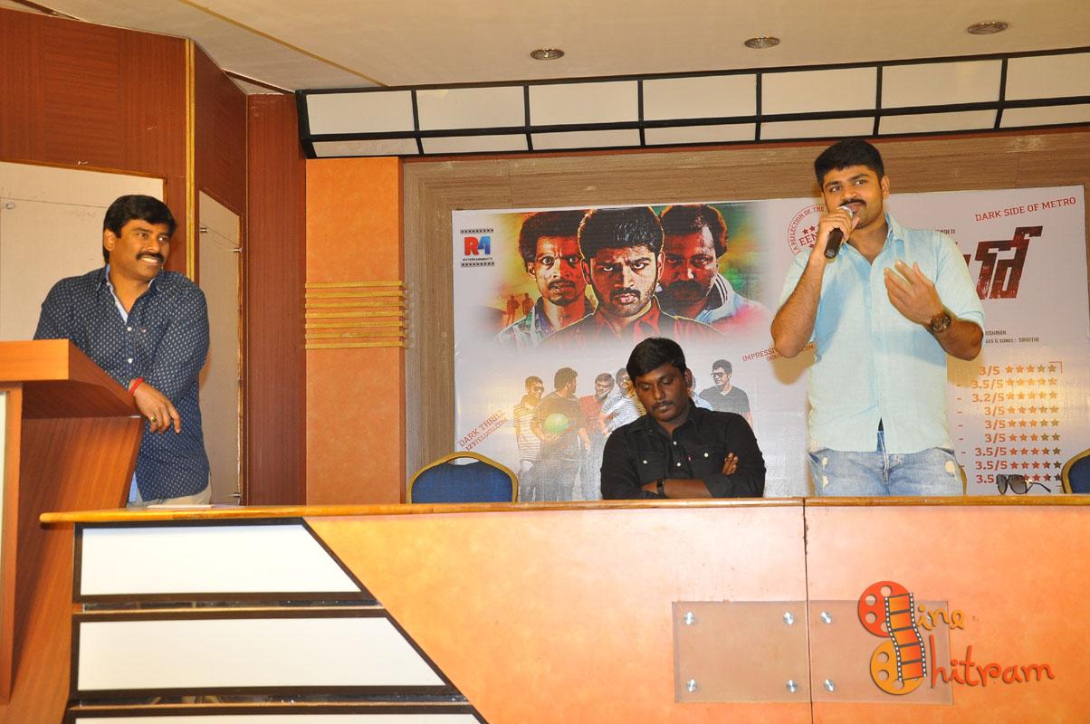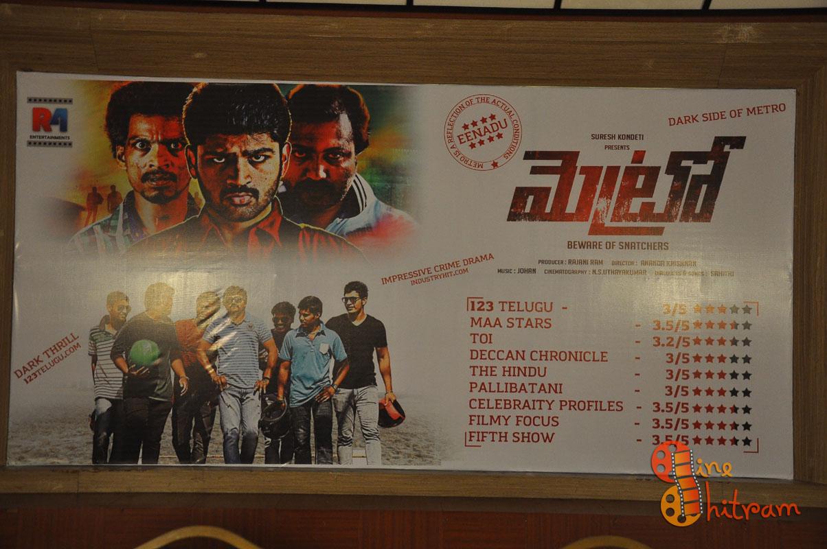 ఆర్ 4 ఎంటర్టైన్మెంట్స్ పతాకంపై `ప్రేమిస్తే`, `జర్నీ`, `పిజ్జా` వంటి బ్లాక్బస్టర్లను అందించిన సురేష్ కొండేటి సమర్పణలో రజనీ తాళ్లూరి నిర్మించిన `మెట్రో` చిత్రం ఈ శుక్రవారం విడుదలై విజయవంతంగా ఆడుతోంది. చైన్ స్నాచింగ్ బ్యాక్ డ్రాప్ లో తెరకెక్కిన ఈ సినిమాకు ప్రేక్షకులకు బ్రహ్మరధం పడుతున్నారు. హౌస్ ఫుల్ కలెక్షన్లతో థియేటర్లలలో దూసుకుపోతుంది. ఈ సందర్భంగా చిత్ర యూనిట్ హైదరాబాద్ లో ఆదివారం సక్సెస్ మీట్ ను ఏర్పాటు చేసింది.